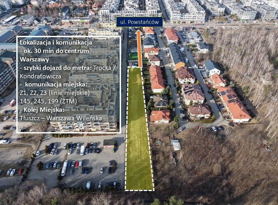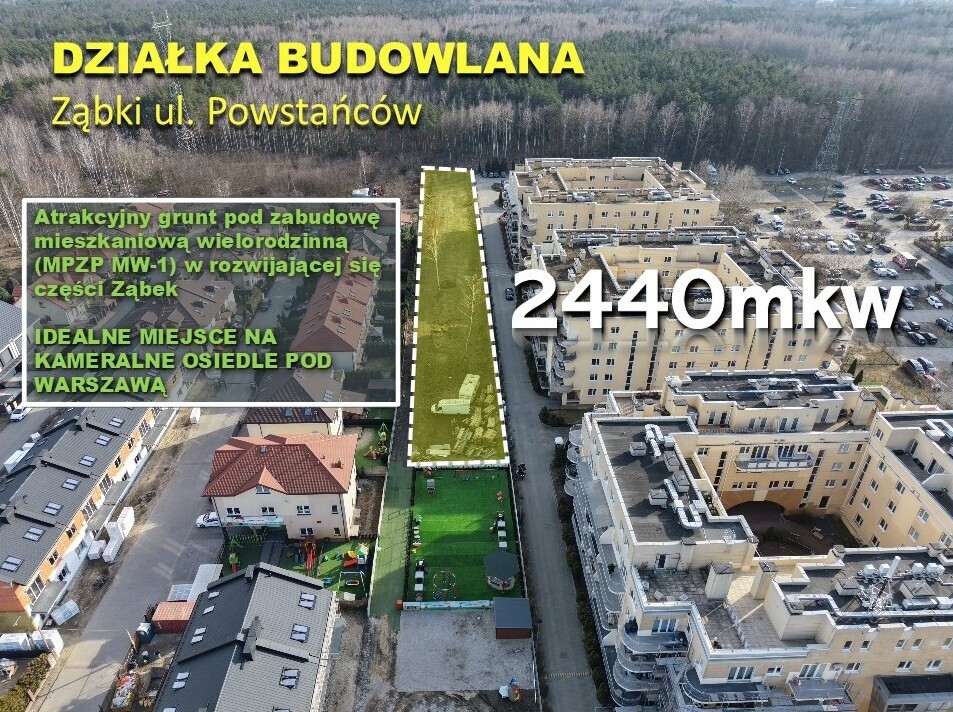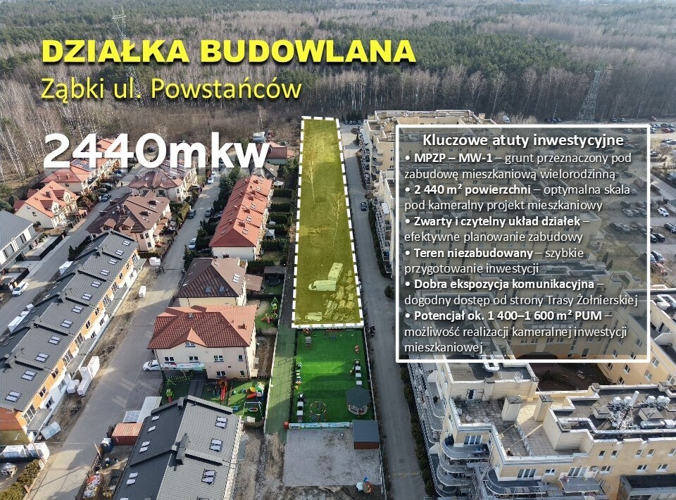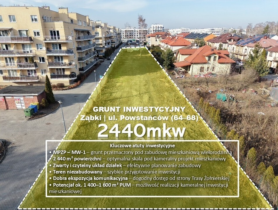 Grunt inwestycyjny – Ząbki, ul. Powstańców (między nr 64 a 68, od strony Trasy Żołnierskiej) | MPZP: MW-1 | 2 440 m² + udział w drodze Na sprzedaż pakiet działek inwestycyjnych w Ząbkach przy ul. Powstańców (pomiędzy numerami 64 a 68), w świetnej lokalizacji od strony Trasy Żołnierskiej. Nieruchomość objęta jest miejscowym planem zagospodarowania przestrzennego z przeznaczeniem