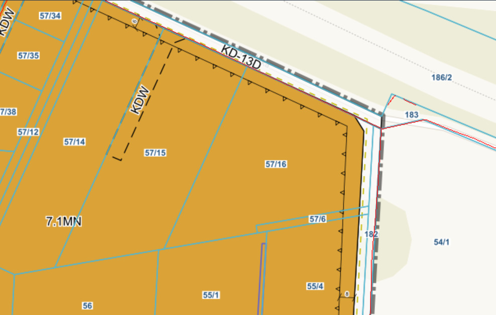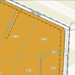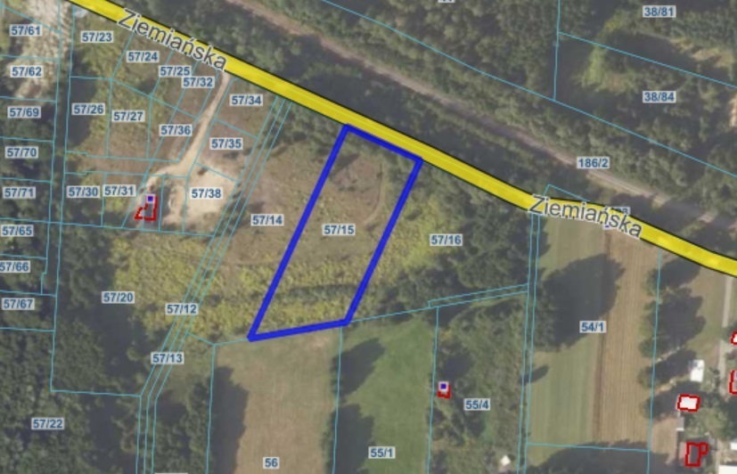 Nieruchomość w kształcie trapezu o wymiarach 49 m, 137  m, 58 m, 104 m i powierzchni 5717 m2.
