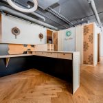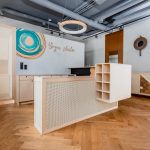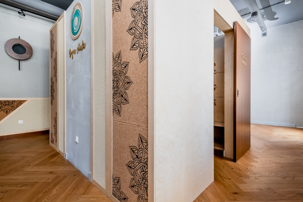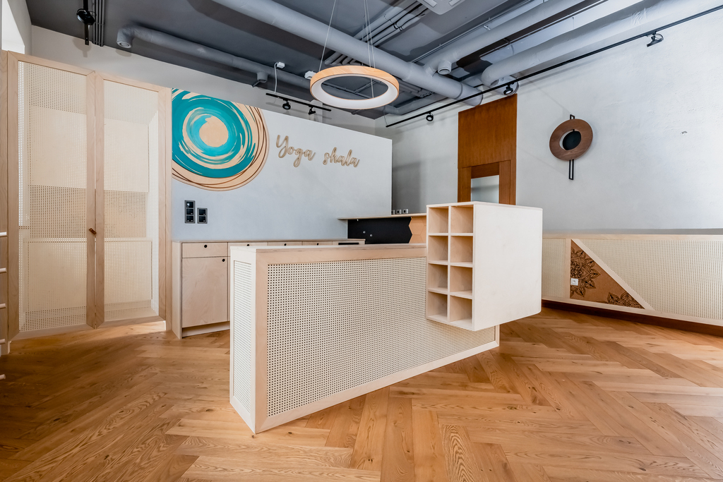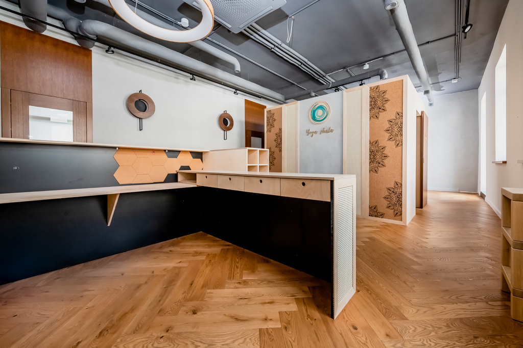 - Recepcja: Profesjonalnie wykonana, stylowa lada recepcyjna z drewnianymi i perforowanymi elementami, z wkomponowanym motywem "Yoga shala" – gotowa do użytku.