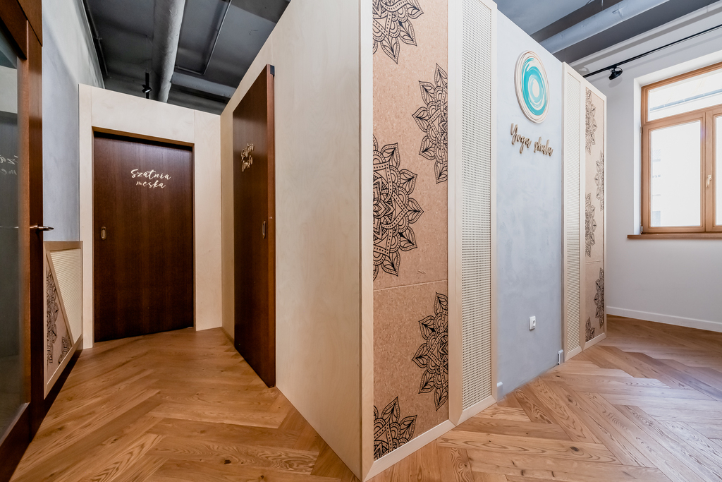 - Ściany: Połączenie jasnych, gładkich powierzchni z panelami z korka zdobionymi motywami mandali, tworzącymi spójną i relaksującą atmosferę (szczególnie widoczne w strefie recepcji i przebieralniach).