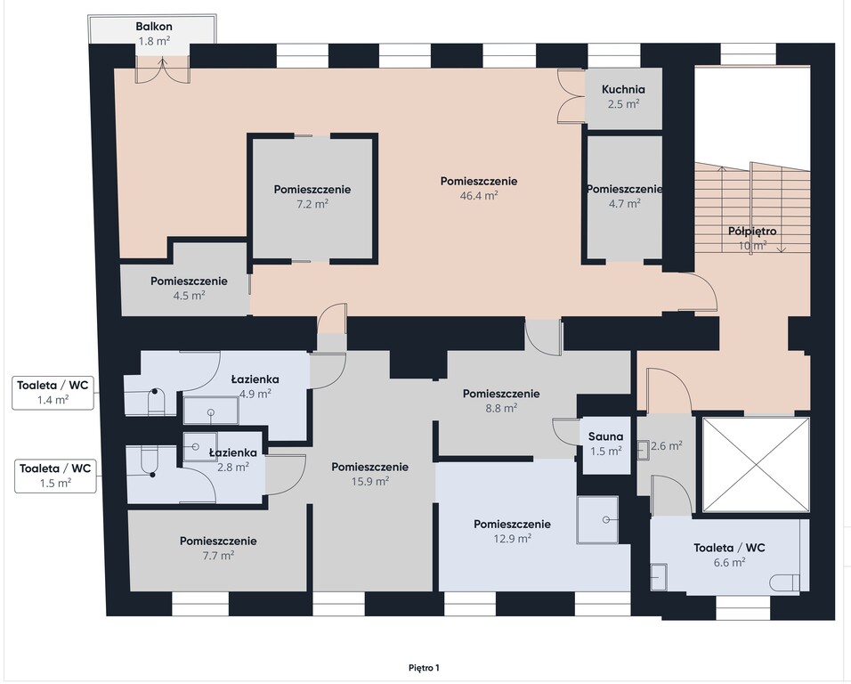 - Sauna (1.5 m²): Dodatkowy atut lokalu, idealny do stworzenia strefy relaksu i odnowy biologicznej.