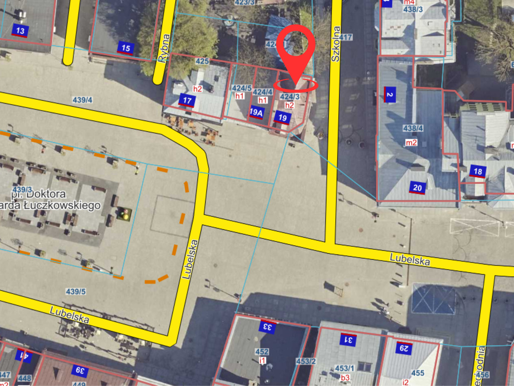 Nieruchomość położona jest u zbiegu ulic Lubelskiej i Szkolnej- z bezpośrednim wejściem z ulicy z dużą, szklaną witryną od południa i wschodu.