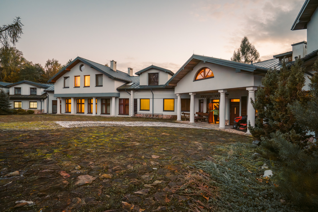 - Oświetlenie zewnętrzne: reflektory LED i lampy parkowe na całym terenie