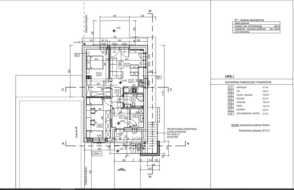 Zbudowany z bloczka betonowego H+H, ocieplony styropianem 20cm .