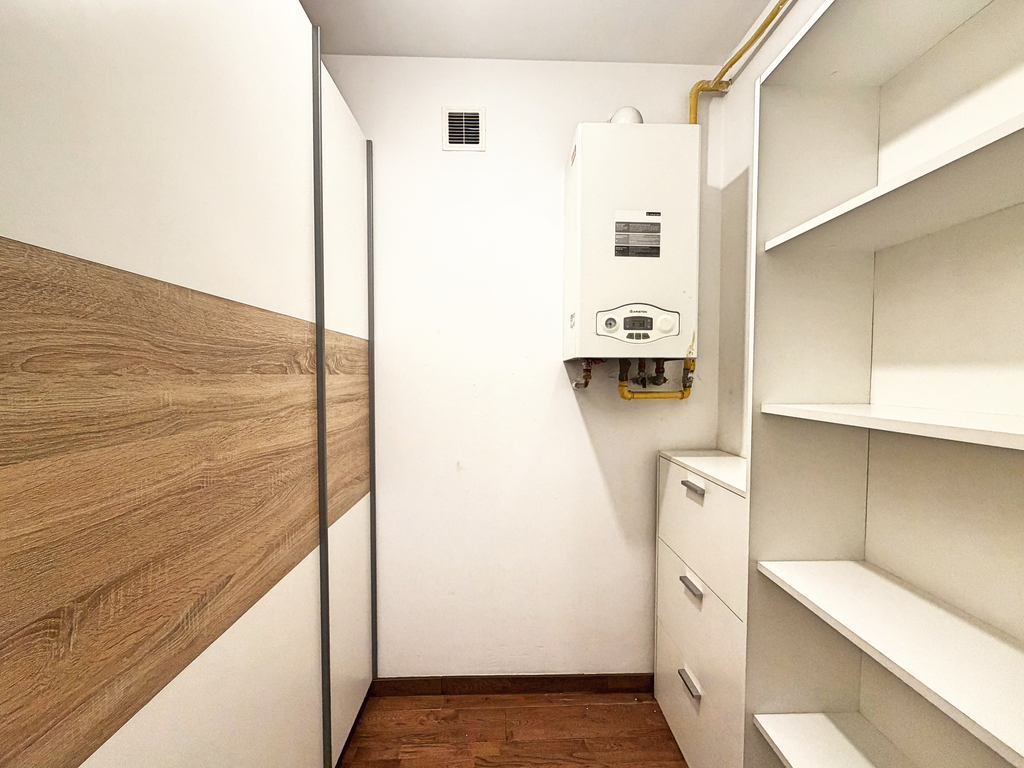 Dodatkowa garderoba to ogromny atut przy tym metrażu – pozwala utrzymać porządek i maksymalnie wykorzystać przestrzeń.