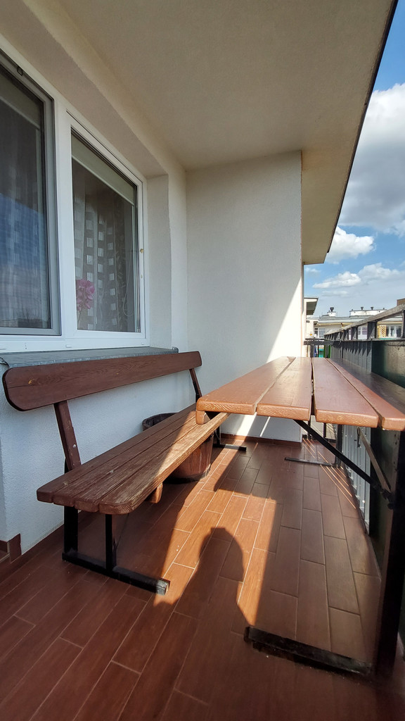 Balkon w pełni zagospodarowany, ławka i stolik, nowe płytki.