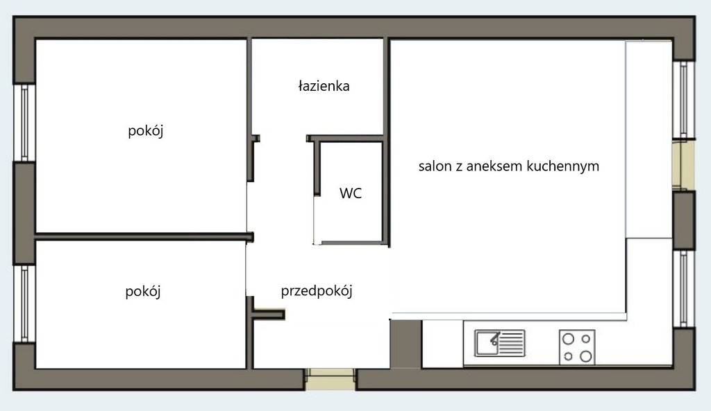 Mieszkanie jest dwustronne z niezależnym wejściem do wszystkich pomieszczeń
