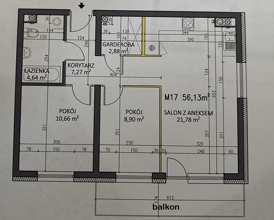 - salonu z aneksem kuchennym z wyjściem na balkon o powierzchni 21,78 m2