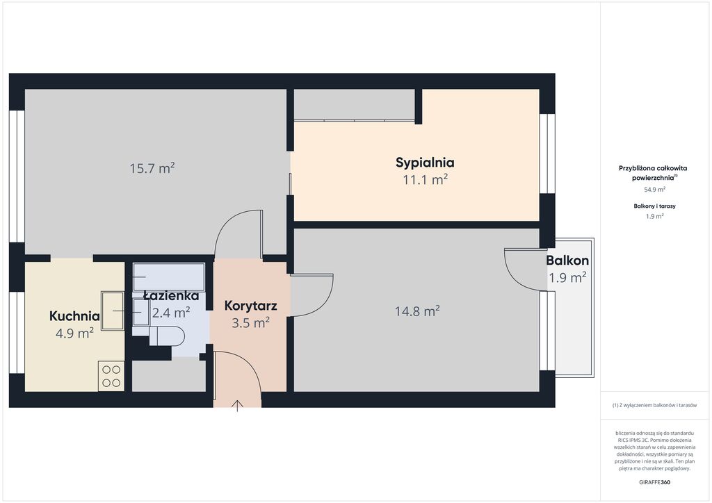 Na powierzchni 54 m² znajdują się: