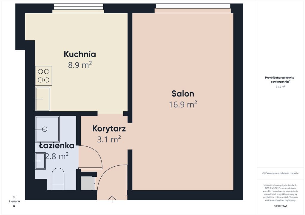 Na powierzchni 31,70 m² znajdują się: