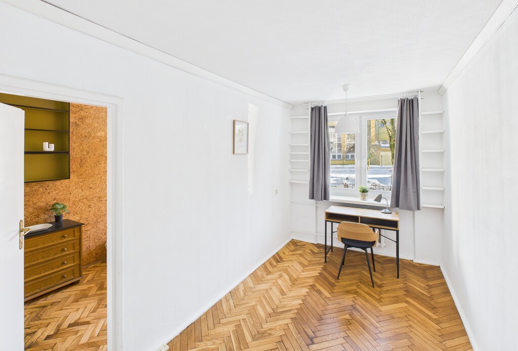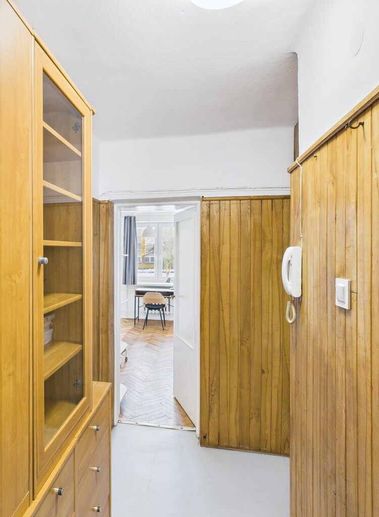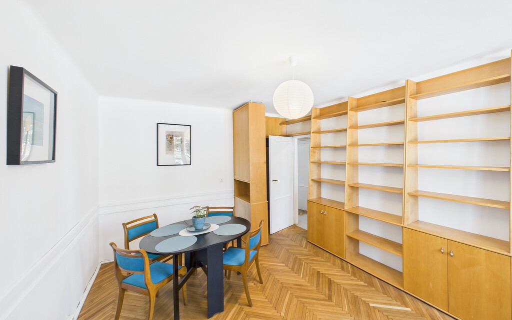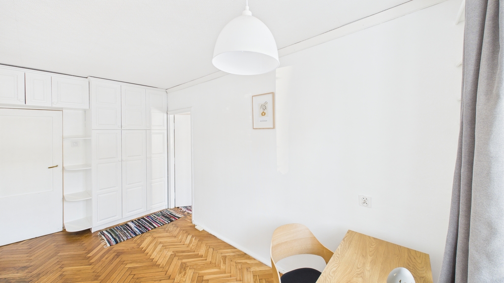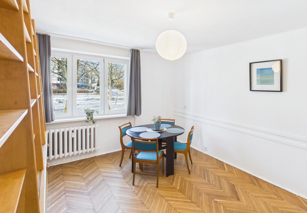 Podłoga to zachowana oryginalna dębowa klepka w klasyczną jodełkę. Podłoga była cyklinowana tylko raz, dzięki czemu zachowała swoją trwałość i naturalny charakter.