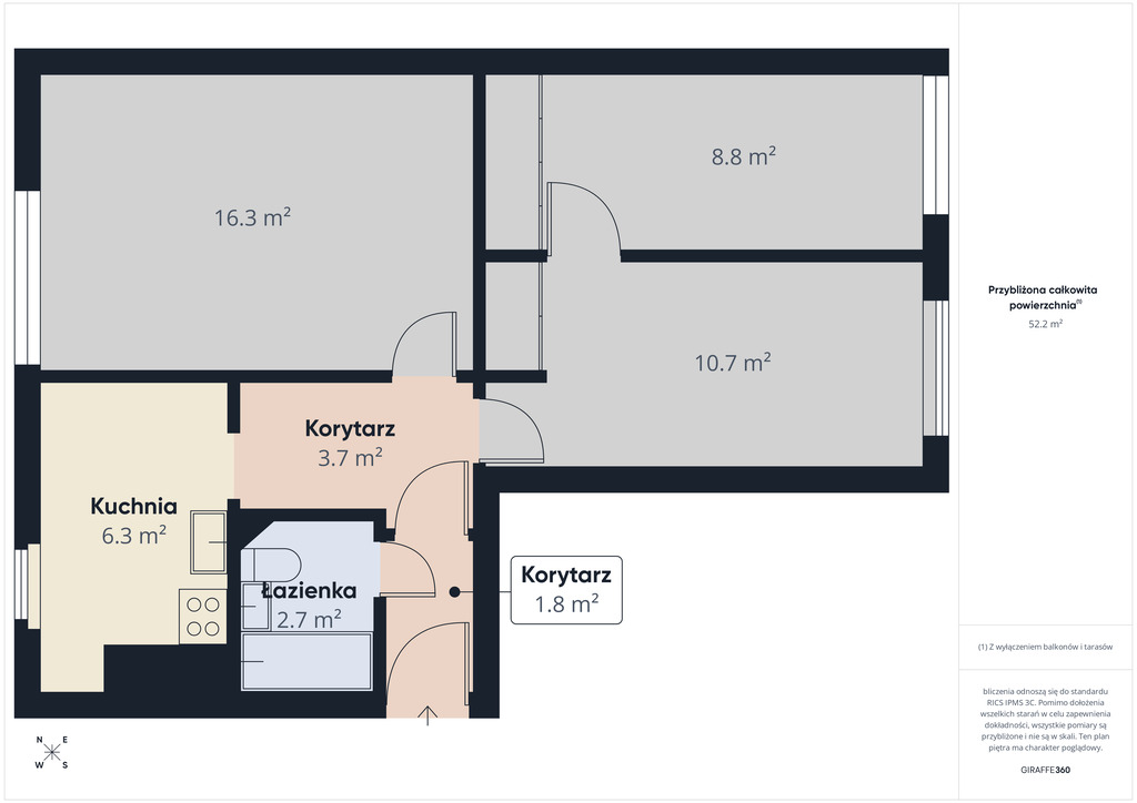 - 3 pokoi: 16,3 m2, 8,8 m2, 10,7 m2