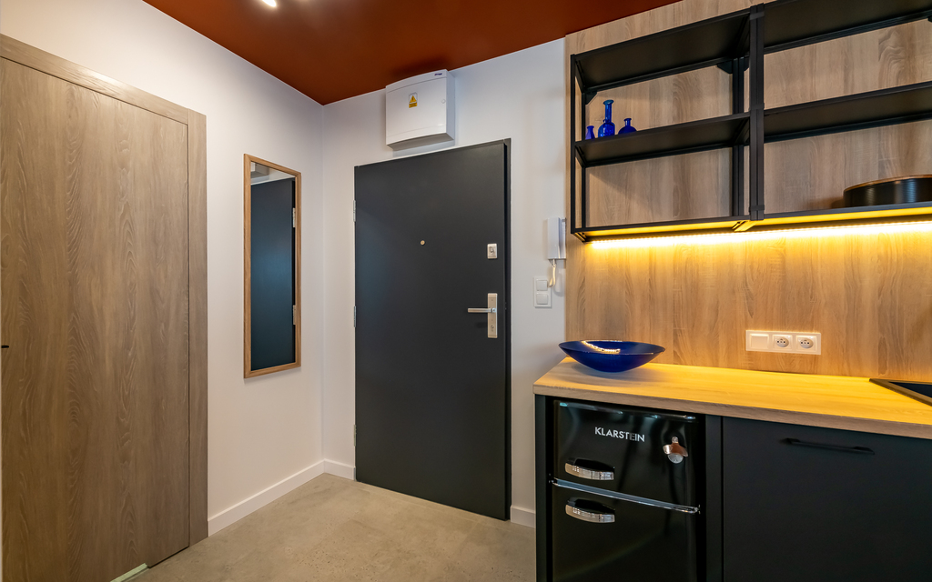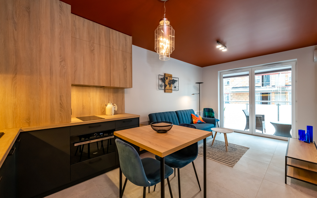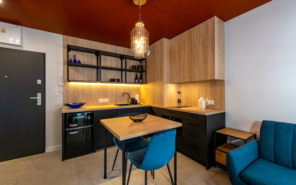 * aneks kuchenny: zabudowa mebli kuchennych, lodówka, zmywarka, płyta indukcyjna, piekarnik elektryczny,czajnik elektryczny, podstawowe wyposażenie (sztućce, talerze, kubki)