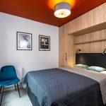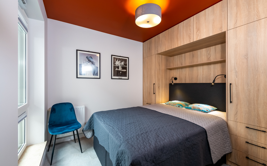 * sypialnia: łóżko podwójne z materacem, szafki nocne, zabudowa szafek
