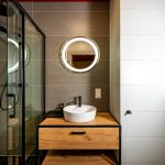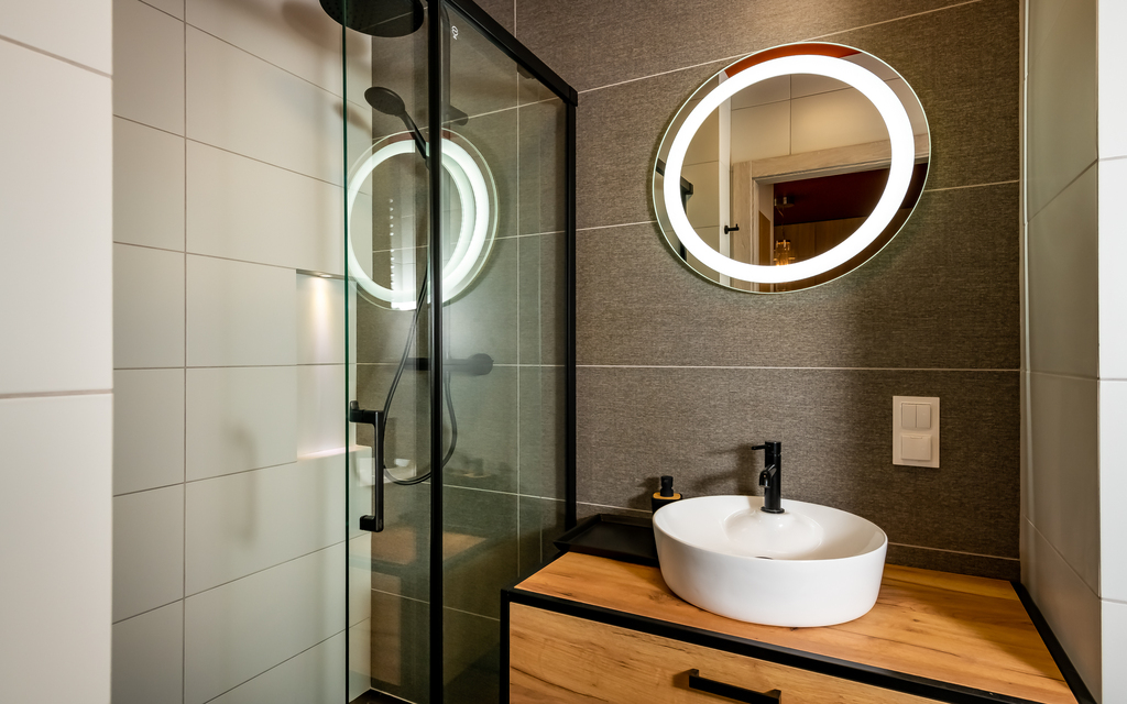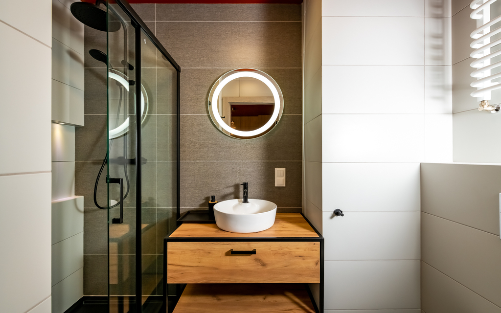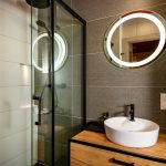 * łazienka (kabina prysznicowa, w-c, umywalka z szafką)