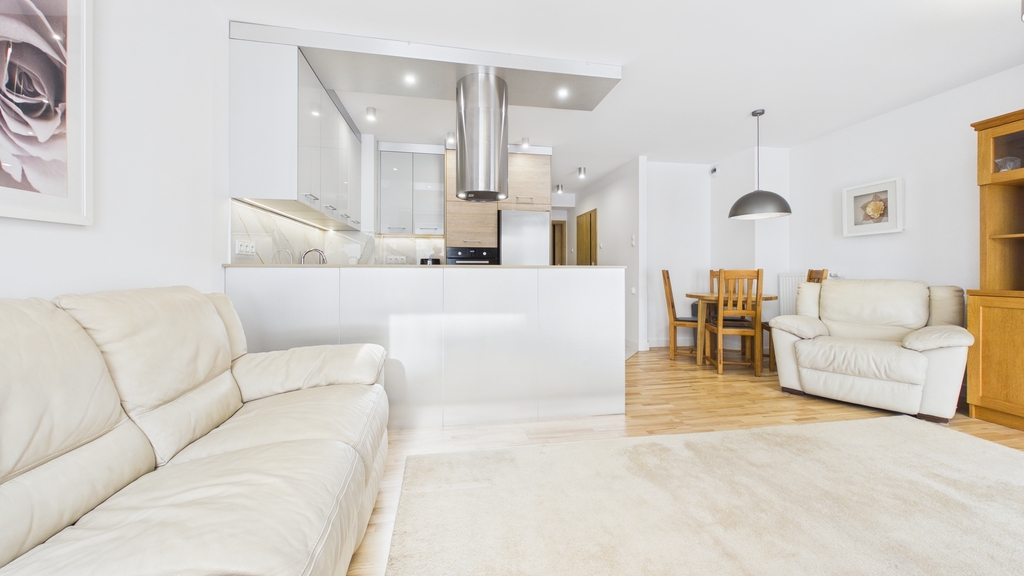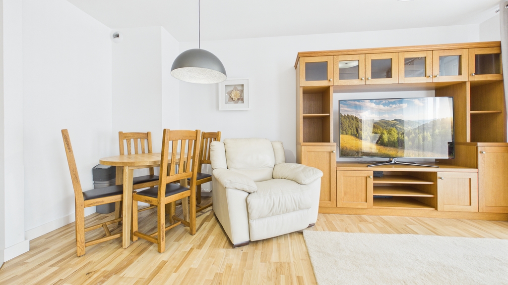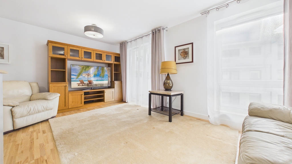 Centralną częścią mieszkania jest otwarta strefa dzienna o powierzchni ponad 34 m², łącząca salon, aneks kuchenny i komunikację. To przestrzeń zaprojektowana z myślą o funkcjonalności – wygodny komplet wypoczynkowy, miejsce na duży telewizor oraz stół jadalniany naturalnie dzielą wnętrze na strefy. Zabudowa kuchenna w nowoczesnym stylu została wyposażona w pełne AGD: płytę indukcyjną, piekarnik, zmywarkę, lodówkę, mikrofalówkę i airfryer. Z salonu prowadzi wyjście na balkon o powierzchni 5,3 m², który stanowi dodatkową przestrzeń do relaksu.