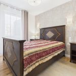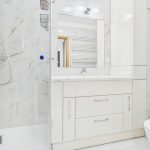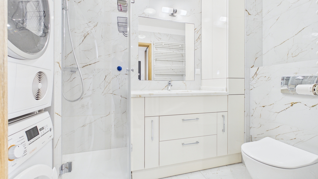 Sypialnia o powierzchni 10,9 m² zapewnia prywatność i spokój. Duże łóżko oraz wydzielona garderoba z komodami pozwalają wygodnie zorganizować przestrzeń. Charakter wnętrza można łatwo dopasować do własnego stylu poprzez zmianę dodatków czy kolorystyki tekstyliów. Łazienka została wykończona w jasnej, eleganckiej tonacji i wyposażona w kabinę prysznicową, zabudowę z umywalką, pralkę i suszarkę.
