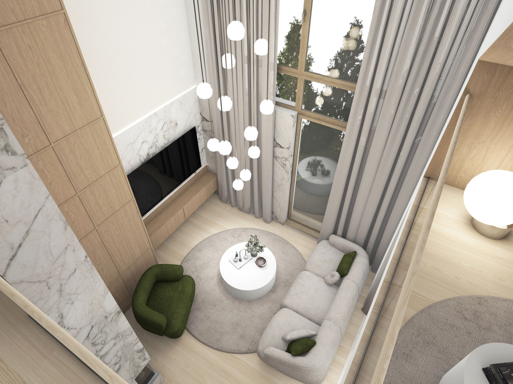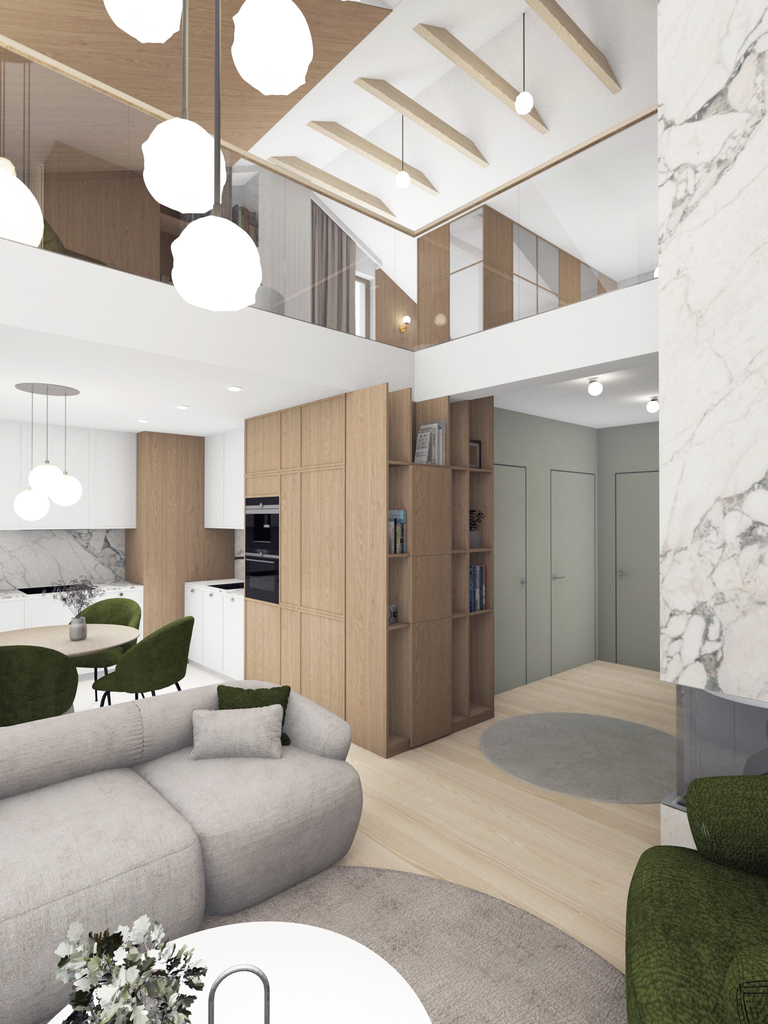 Ta unikalna koncepcja wnętrza oferuje otwartą, dwupoziomową przestrzeń, która jest nie tylko praktyczna, ale również nadaje mieszkaniu wyjątkowy, nieszablonowy charakter.