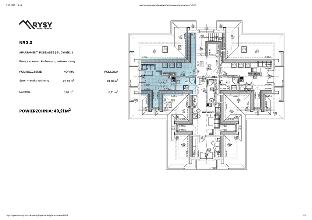 Dwupokojowy apartament  inwestycyjny o powierzchni 44,59 m2 zlokalizowany na pierwszym piętrze  w budynku nr. 1 inwestycji "Rezydencja Rysy".