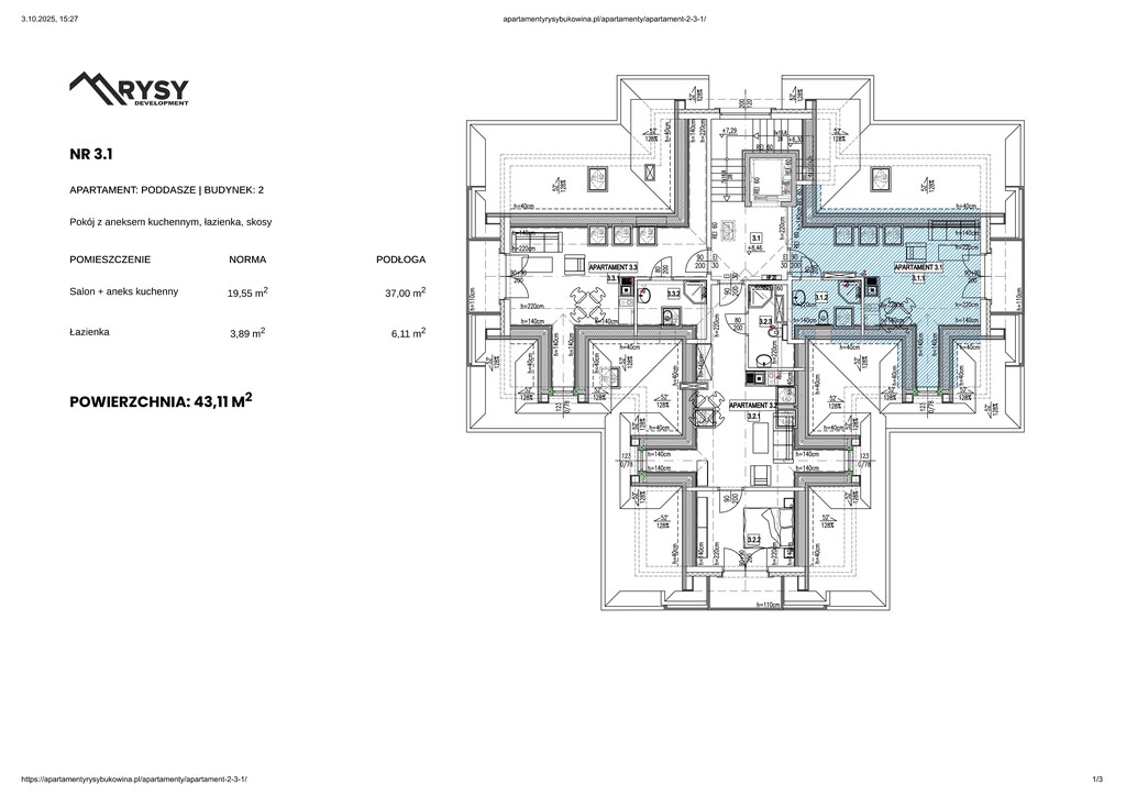 Dwupokojowy apartament inwestycyjny o powierzchni 44,59 m2 zlokalizowany na pierwszym piętrze w budynku nr. 1 inwestycji "Rezydencja Rysy"