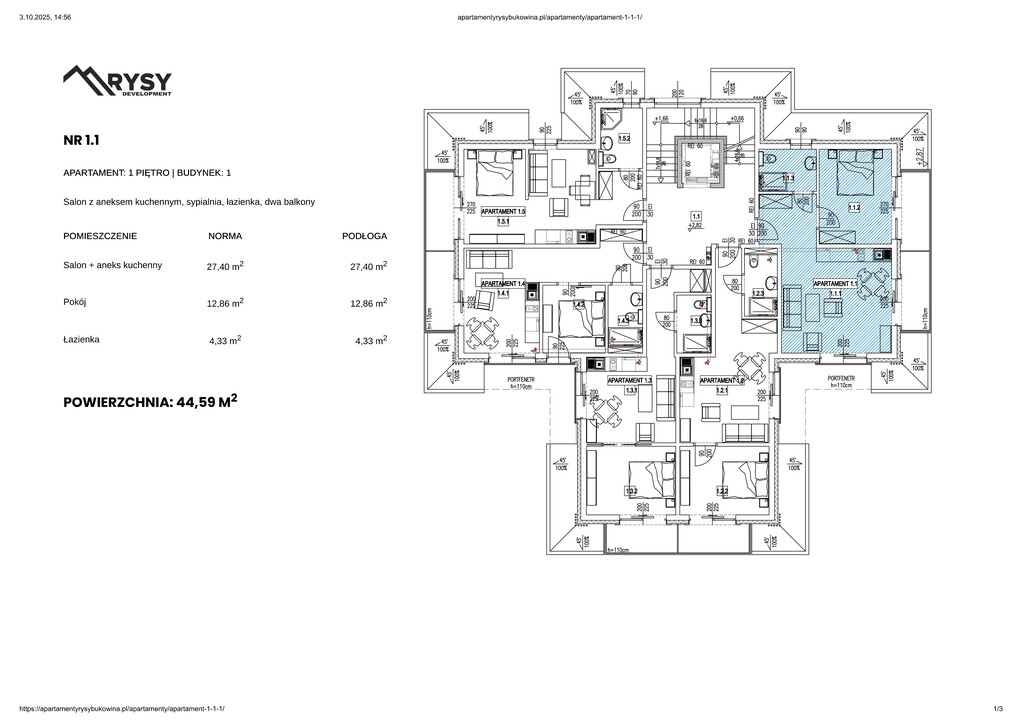 Dwupokojowy apartament inwestycyjny o powierzchni 44,59 m2 zlokalizowany na pierwszym piętrze w budynku nr. 1 inwestycji "Rezydencja Rysy"