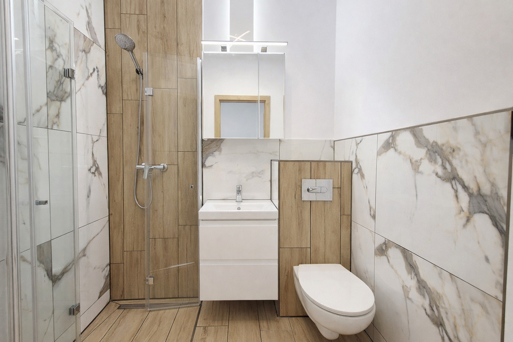 W łazience ubikacja w zabudowie, kabina prysznicowa ze składanymi drzwiami, co daje więcej przestrzeni.