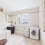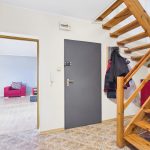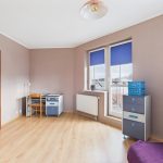 - podłogi: panele (pokoje, jadalnia, przedpokój na poziomie drugim), płytki ceramiczne (kuchnia, łazienki, przedpokój na poziomie pierwszym),