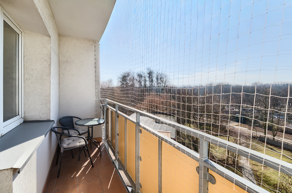 Do mieszkania przynależy również duży balkon oraz piwnica, co zapewnia dodatkową przestrzeń do przechowywania.
