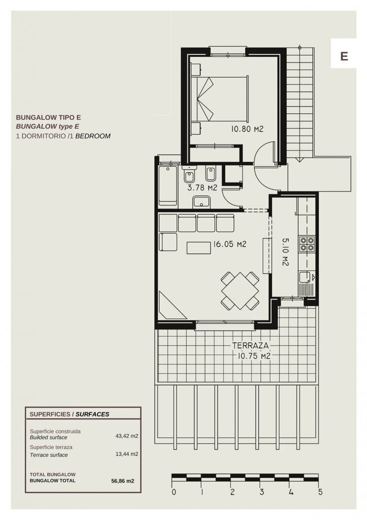 Piękne apartamenty typu bungalow na najwyższym piętrze z 1 sypialnią, 1 łazienką, kuchnią na otwartym planie z częścią wypoczynkową, wyposażonymi szafami i tarasami.