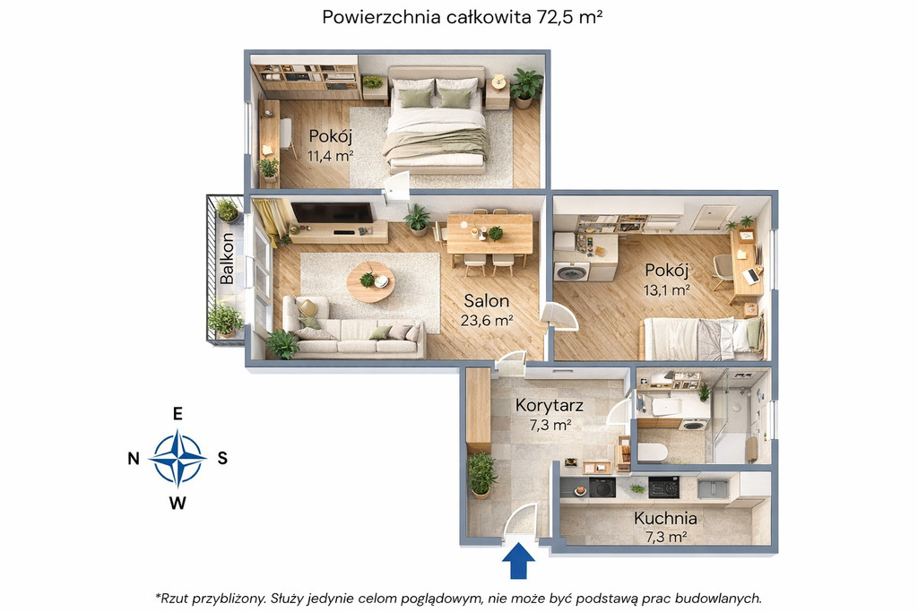 Przedstawione wizualizacje i grafiki mają charakter wyłącznie poglądowy i stanowią wyłącznie materiał pomocniczy, ułatwiający zorientowanie się w ogólnym wyglądzie oferowanej nieruchomości.