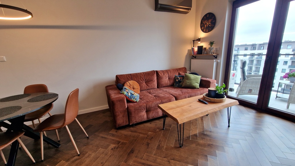 - Przestronny Salon: sofa z funkcją spania, stolik kawowy, stół z krzesłami, klimatyzacja.