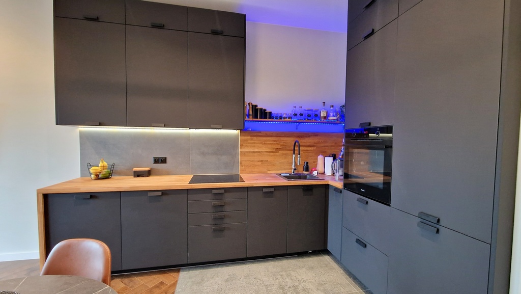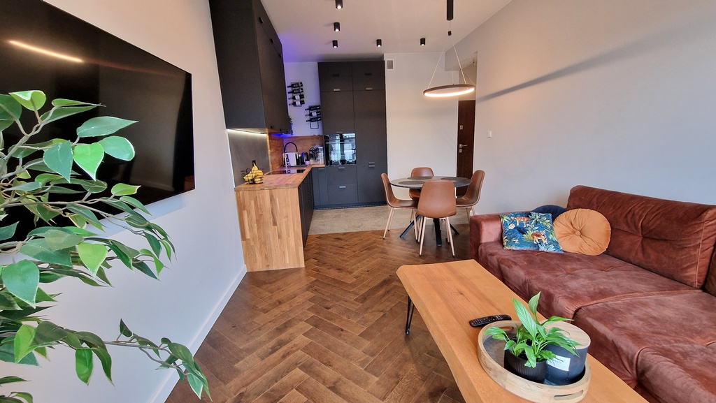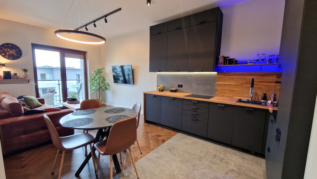 - Aneks kuchenny: meble na wymiar wyposażone w sprzęt AGD (lodówka, zmywarka, płyta indukcyjna, piekarnik )