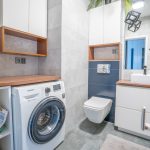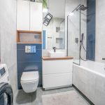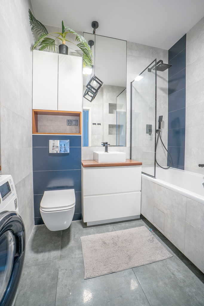 Łazienka – elegancka armatura, kabina prysznicowa, pralka, wysokiej jakości kafle.