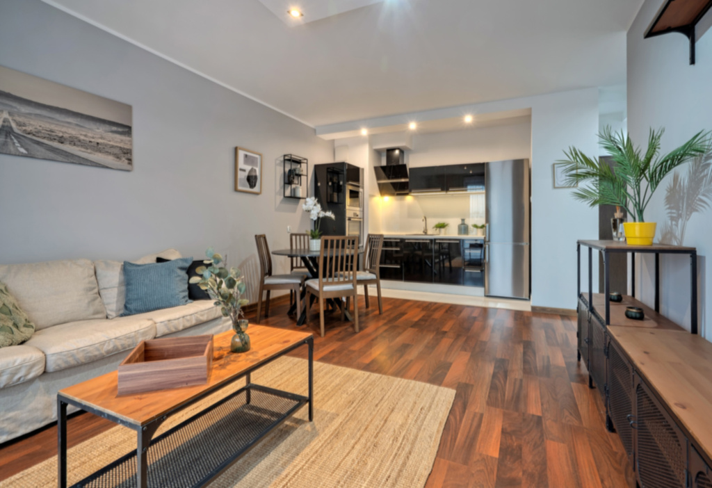 - przestronnego salonu z aneksem kuchennym z wyjściem na słoneczny balkon
