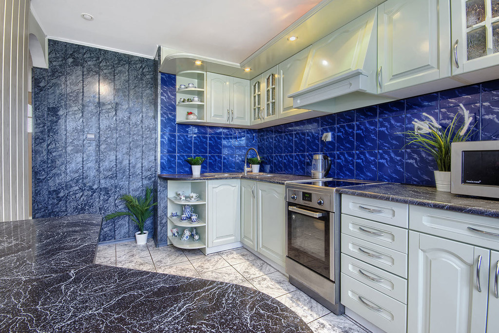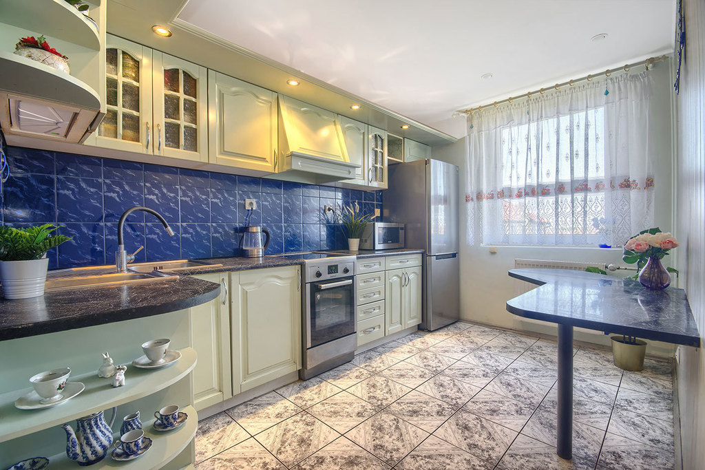 Kuchnia jest wyposażona w meble oraz sprzęt AGD.