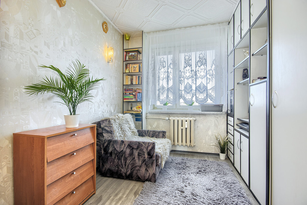 Mieszkanie jest bardzo jasne oraz przestronne. Wymaga odświeżenia/remontu. Okna plastikowe w salonie i kuchni, w sypialni drewniane. Ekspozycja południowo-zachodnia i północno wschodnia. Okna (w salonie) wychodzą na stronę południowo- zachodnią.