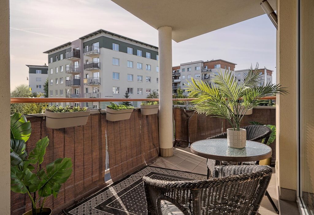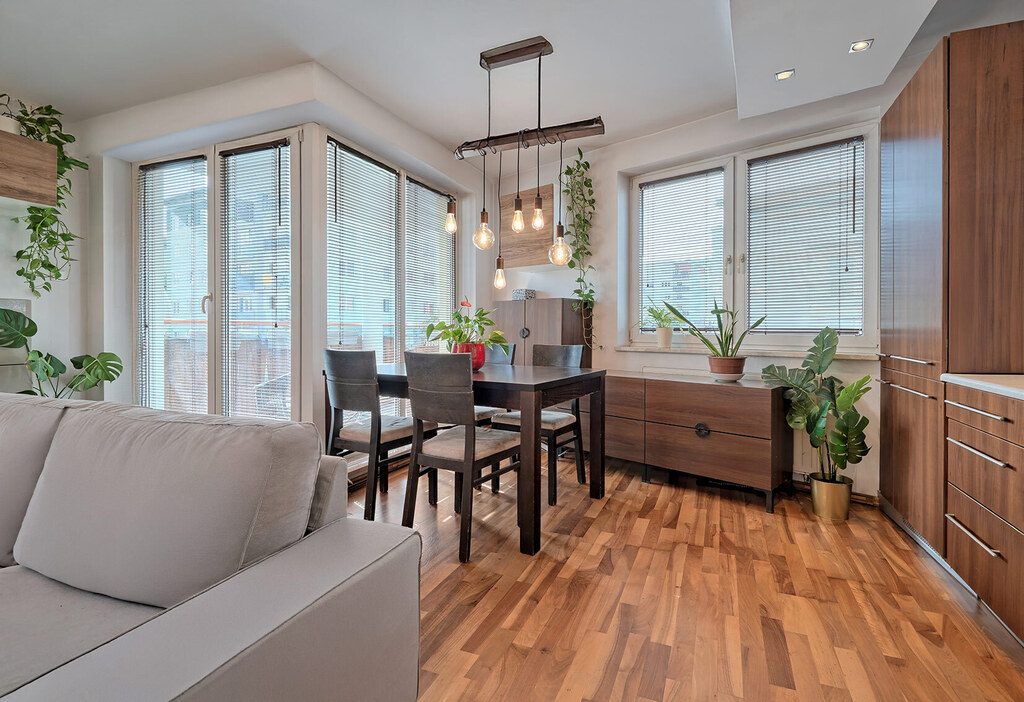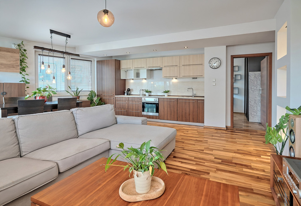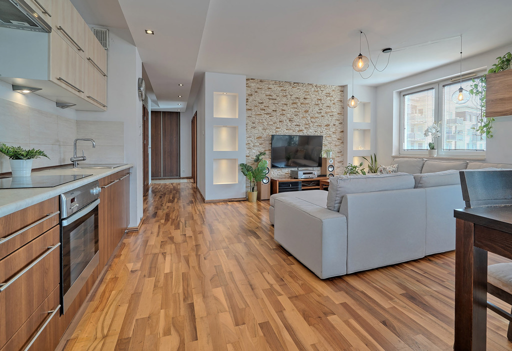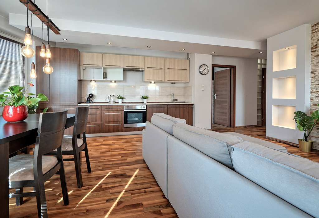 - przestronny salon z aneksem kuchennym z wyjściem na duży, słoneczny balkon