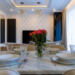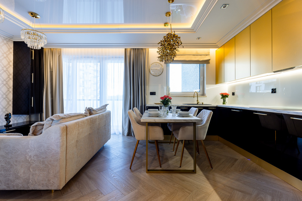 W salonie znajdują się m.in.: kanapa oraz zabudowa meblowa zostały wykonane na zamówienie (fronty akrylowe wysokiej jakości), fazowane lustra na ścianach w sztukaterii ściennej. Dodatkowego charakteru pomieszczeniu dodaje elegancki sufit napinany oraz wysokiej klasy oświetlenie.