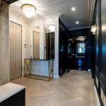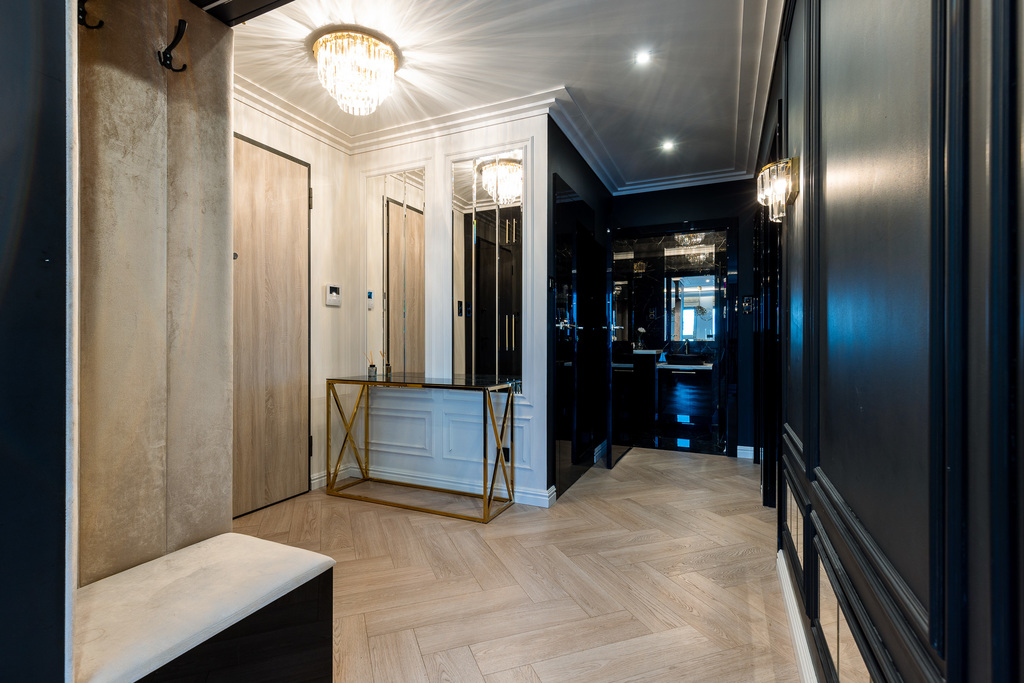 W przedpokoju znajduje się pojemna szafa wykonana na wymiar wraz z tapicerowanym siedziskiem. Na przeciwległej ścianie zainstalowano także ozdobne fazowane lustra.