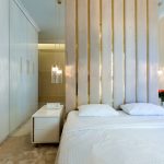 W sypialni znajduje się dwuosobowe, tapicerowane łóżko z ozdobnym wezgłowiem, szafki nocne, oraz przestronna szafa z frontami akrylowymi w kolorze białym.