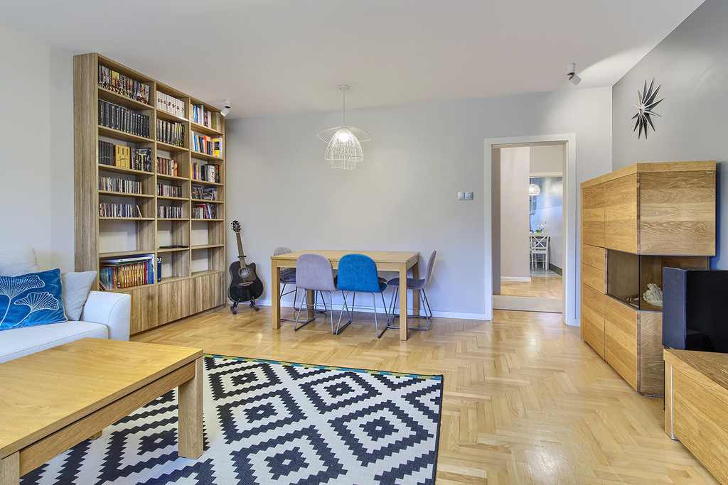 W pokojach na podłodze ułożony jest piękny parkiet, w pozostałych pomieszczeniach płytki.