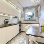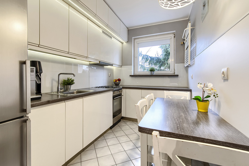 Kuchnia została zabudowana meblami na wymiar z pięknymi, białymi, lakierowanymi frontami na systemach marki Blum, wyposażona jest w sprzęt AGD: piekarnik, płyta gazowa, zmywarka, okap.