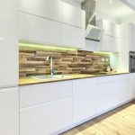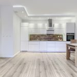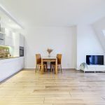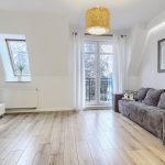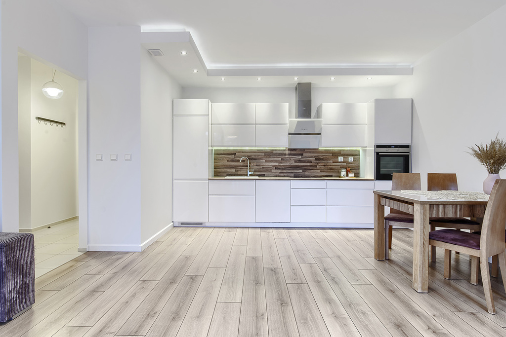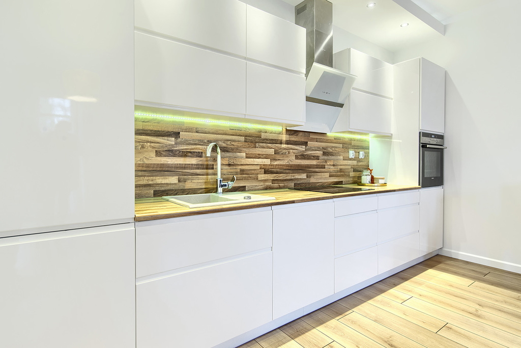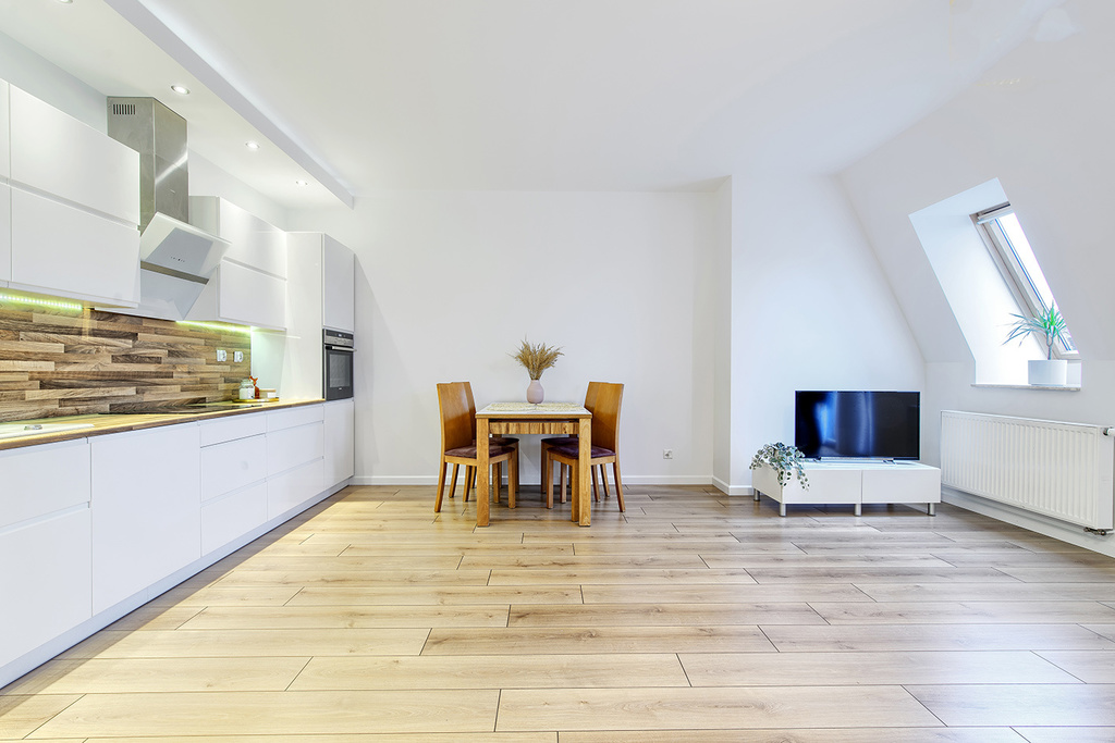 Kuchnia została zabudowana meblami na wymiar z pięknymi, białymi, lakierowanymi frontami na systemach marki Blum. W pełni wyposażona w sprzęt AGD: piekarnik, płyta indukcyjna, zmywarka 60 cm, okap, lodówka z zamrażarką.