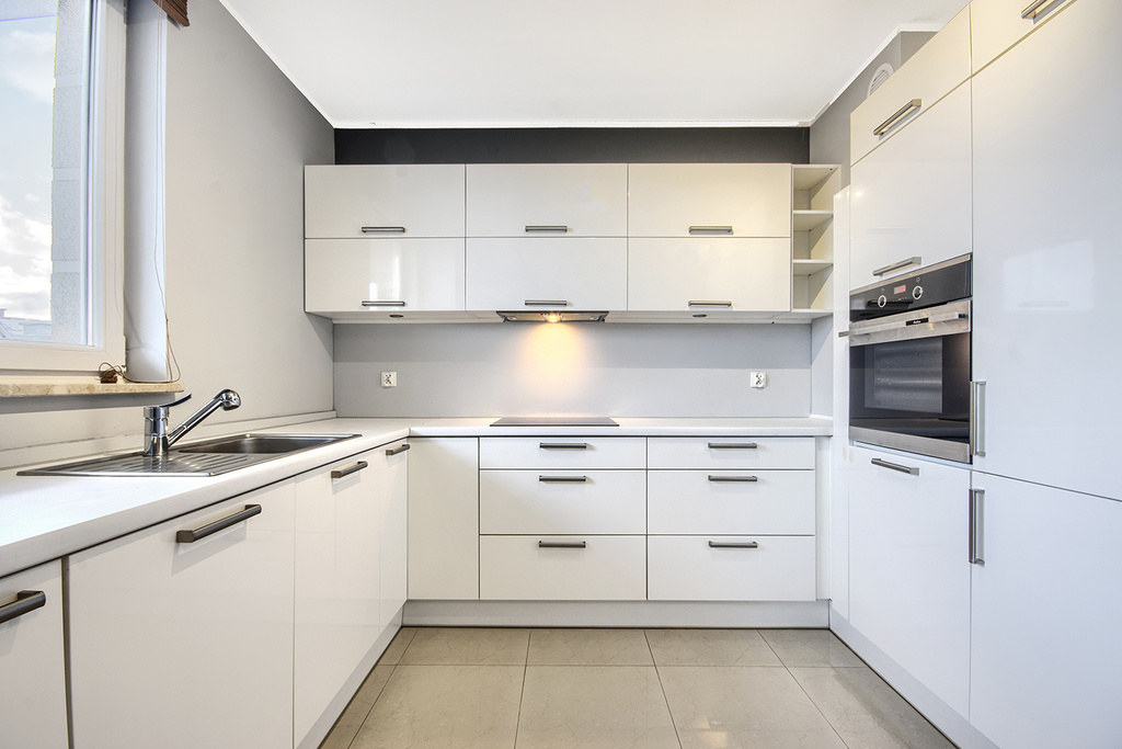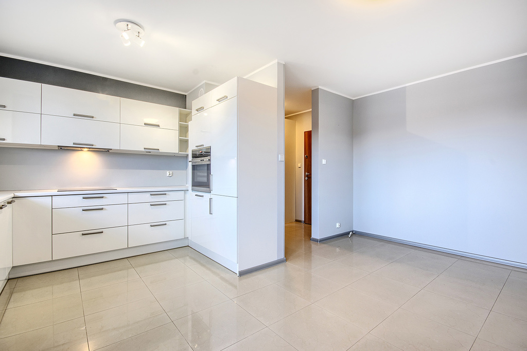 Kuchnia - duże i pojemne szafki w kolorze biały połysk. Zmywarka, płyta, piekarnik i lodówka w zabudowie