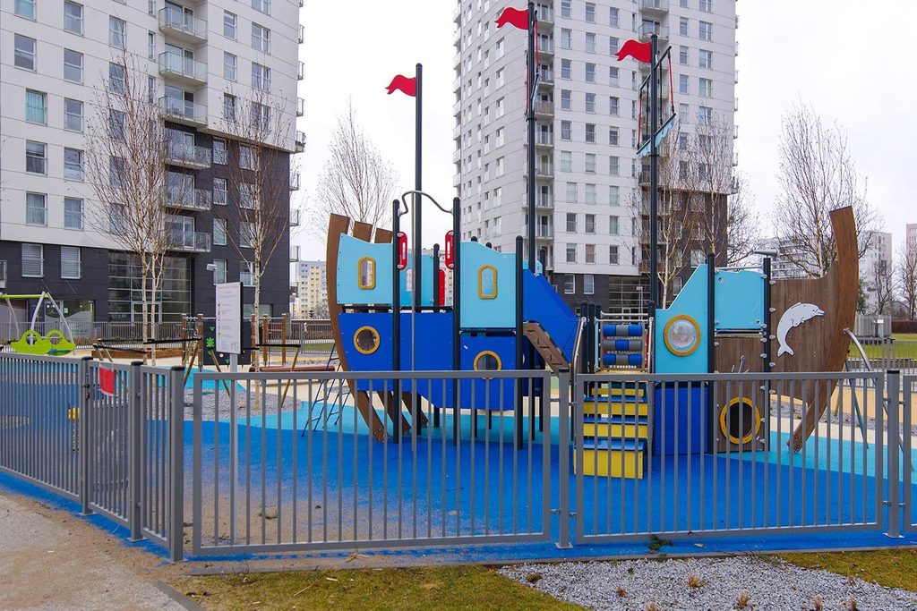 W centralnej części inwestycji znajduje się miejski park do spędzenia wolnego czasu wraz z placem zabaw dla najmłodszych.