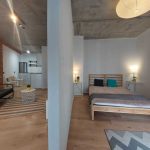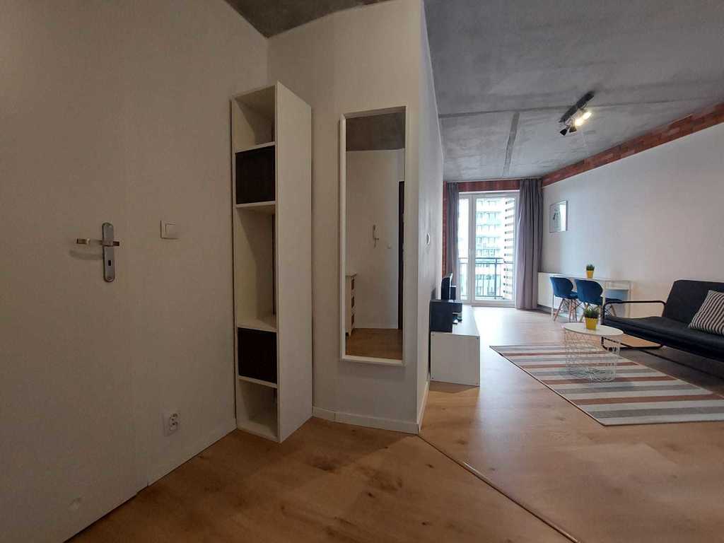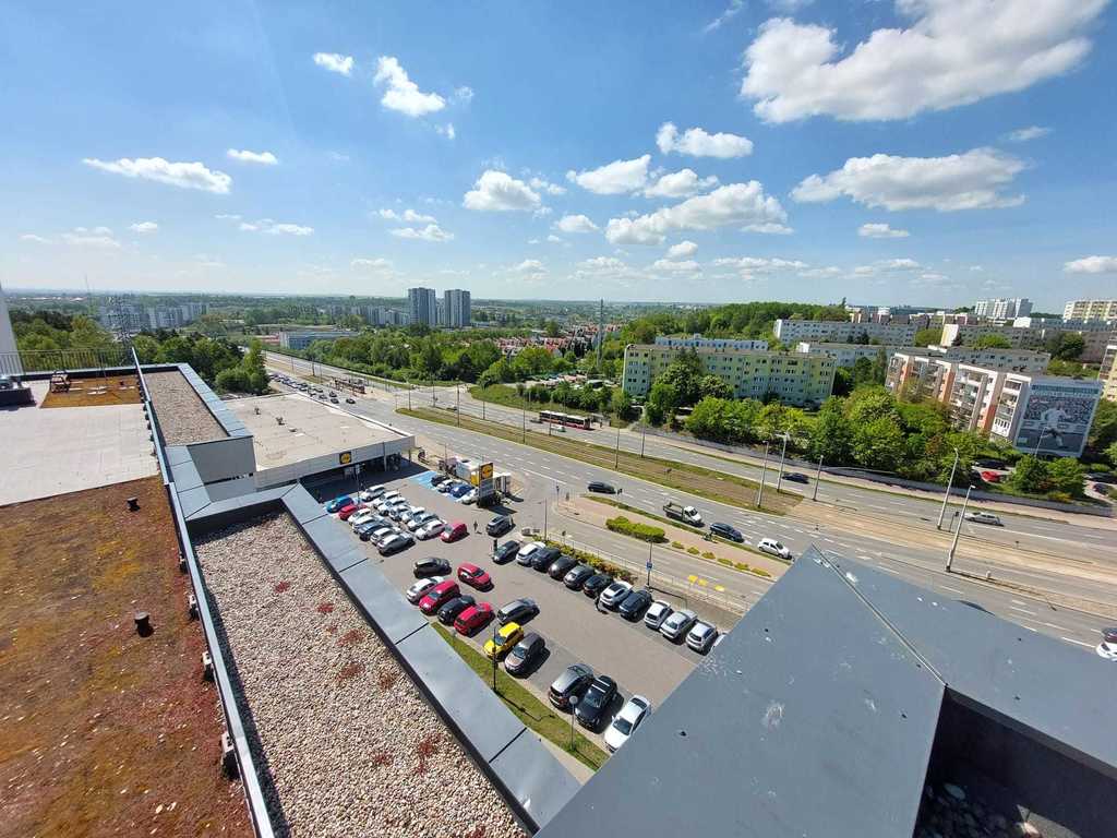 - słonecznego salonu z aneksem kuchennym oraz wyjściem na balkon z widokiem na miasto,