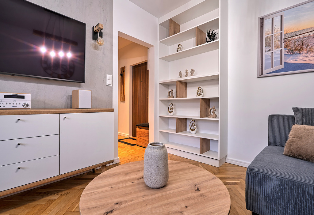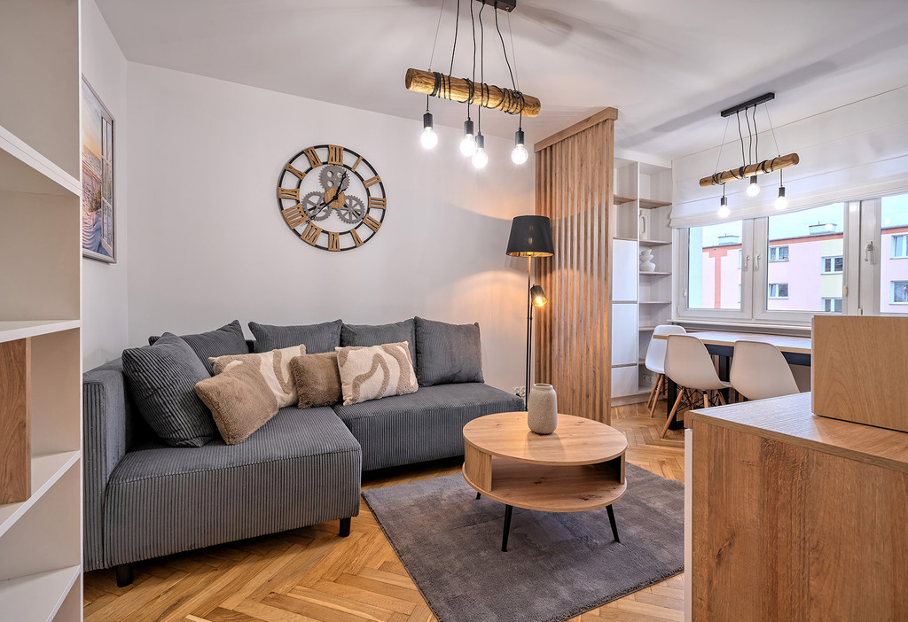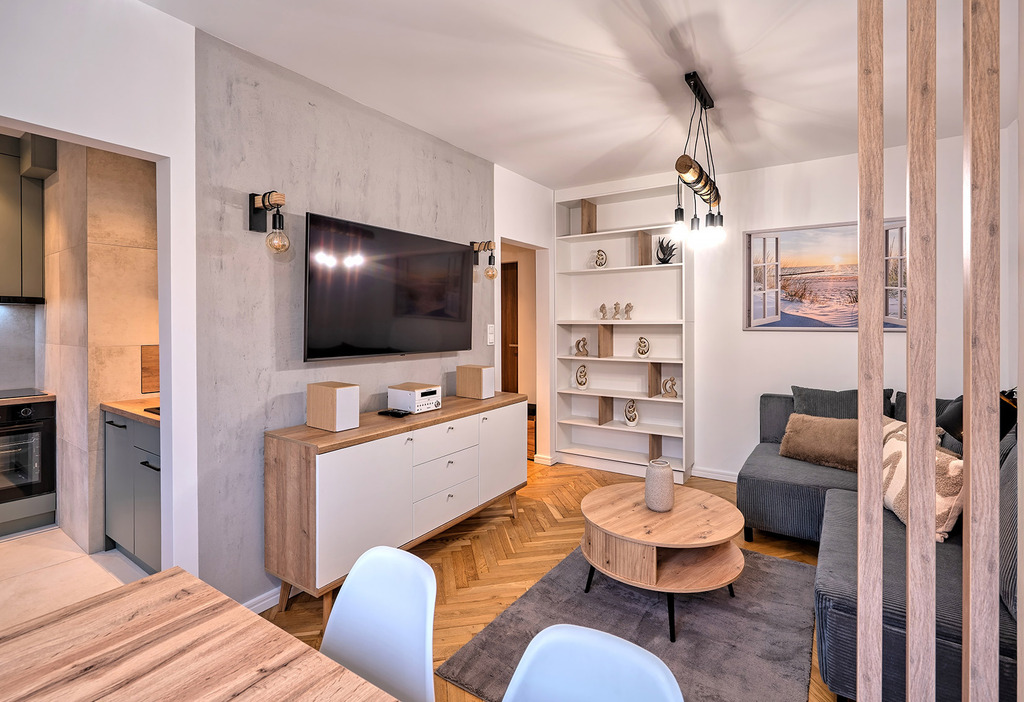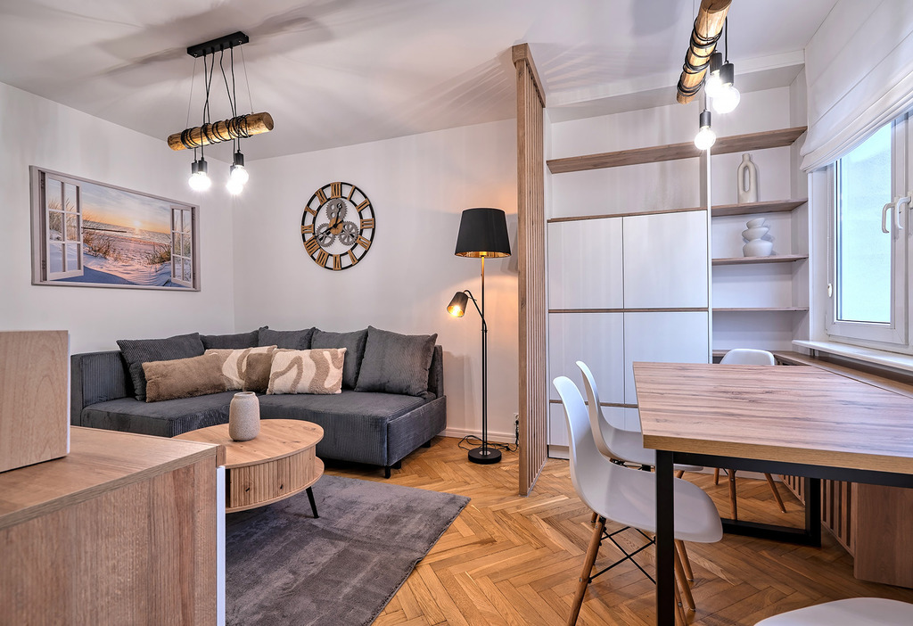 Pokój dzienny: Łączy w sobie strefę sypialną z wypoczynkową oraz jadalną nawet dla 4 osób. Dużo miejsca do przechowywania.