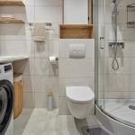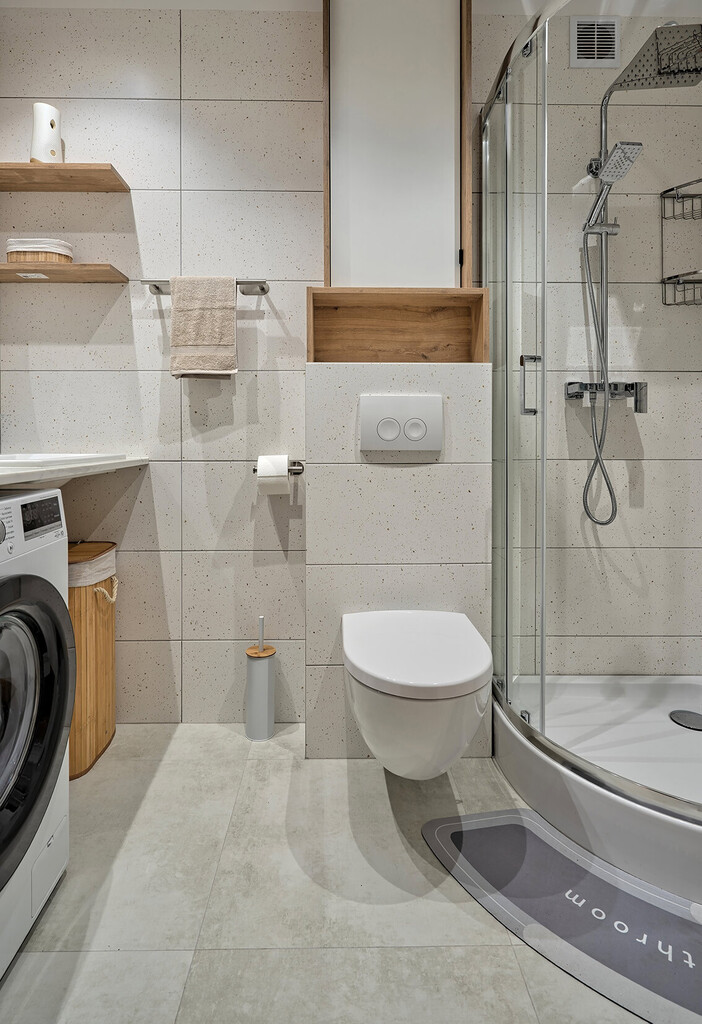 Łazienka: Gustownie urządzona. Duża kabina prysznicowa, pralka. Zawiera pełne nieosobiste wyposażenie.