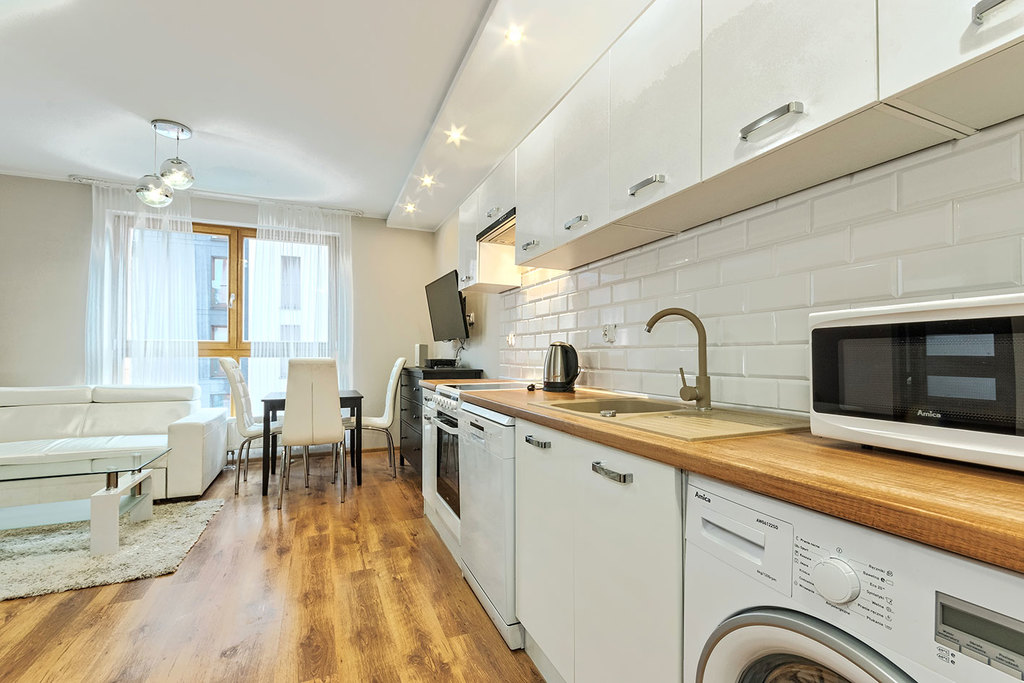 - lodówkę, pralkę, zmywarkę, piekarnik, okap, mikrofalówkę, garnki, patelnie, naczynia i sztućce.