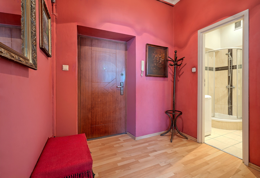 Wnętrze wypełniają piękne obrazy oraz stylowe, stare meble, które tworzą niezwykle klimatyczną przestrzeń inspirowaną historią miejsca. W mieszkaniu zachowały się autentyczne drzwi wewnętrzne, które podkreślają jego historyczny charakter i nadają wnętrzu wyjątkowej atmosfery.